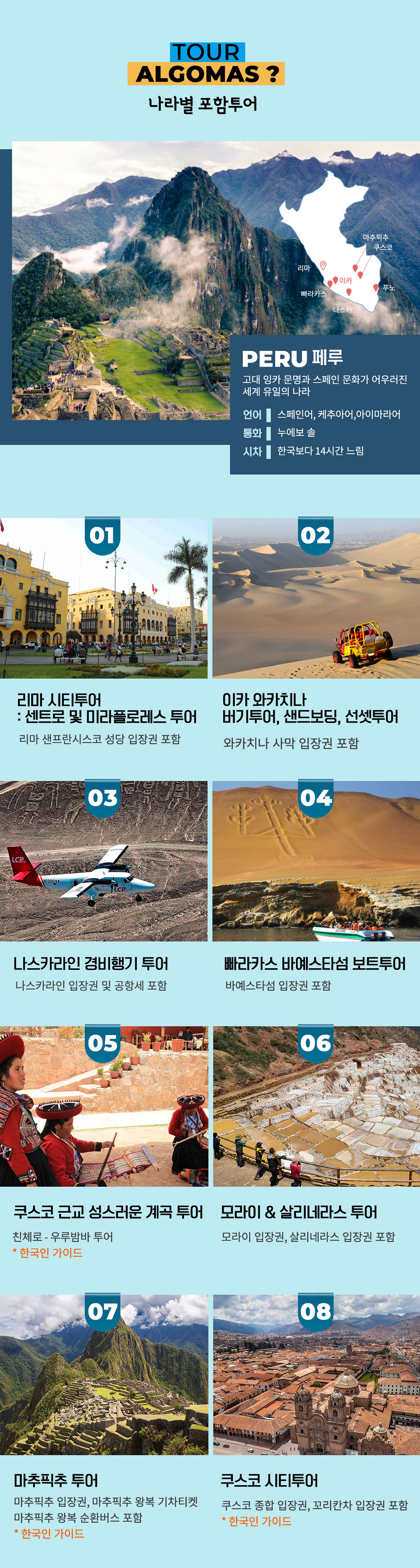 ■ 본 여행은 남미 상품은 일부 구간 자유일정과 자유식이 포함된 상품입니다. 투어일정의 대부분이 패키지 단체일정으로 진행되나, 일부 구간은 여행자분들만의 자유로운 일정과 식사를 즐기실 수 있도록 보장해드리고 있습니다. 자유일정 시 인솔자가 몇몇 추천 방문지 및 식당을 안내 드려 도움을 드리나, 따로 예약 진행 및 자유일정에 동행하지는 않습니다.