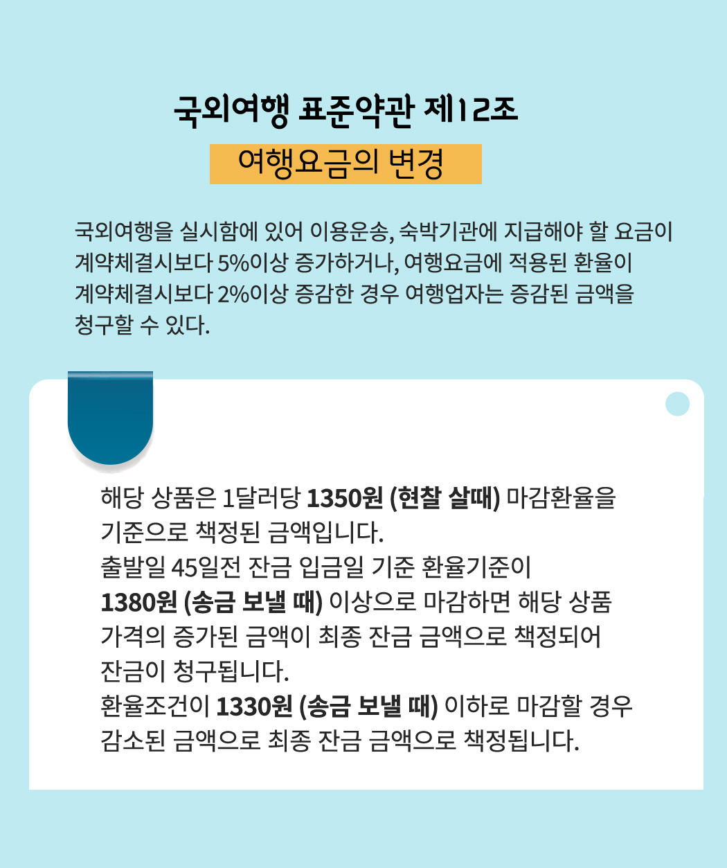 1. 일정별 출발 확정 후 항공 발권을 진행하며, 발권 후 날짜변경, 취소할 경우 전액환불이 불가합니다. 청약서 및 본 약관의 내용을 확인하신 후 신중히 결정해 주셔야합니다.